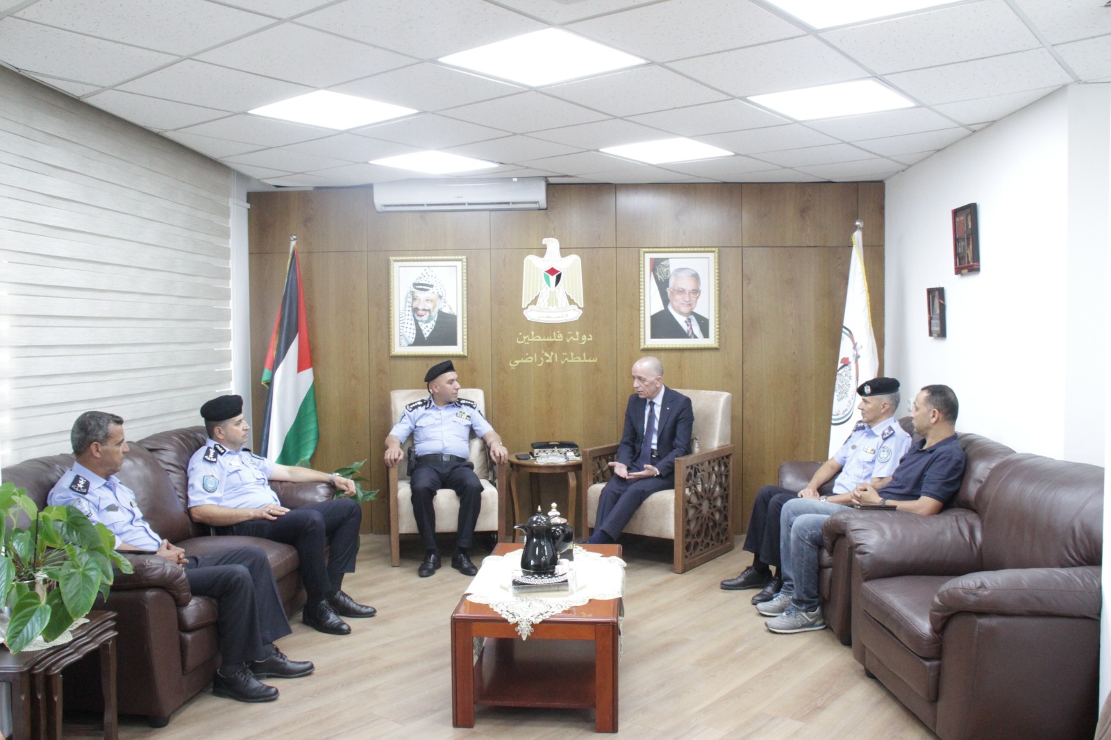 استقبل التميمي الوفد معبراً عن اعتزازه بالدور الوطني لجهاز الشرطة وجهوده في إرساء منظومة القانون والحفاظ على السلم الأهلي والمجتمعي، كما وشكرهم على جهودهم المبذولة مع طواقم سلطة الأراضي في إزالة التعديات على أملاك الدولة.